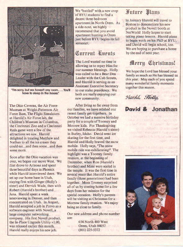 In January Harold will travel to Boston to demonstrate his new product in the Novell booth at NetWorld. Holly hopes to start taking piano lessons. Harold plans to begin work on his Ph.D. at BYU, and David will begin school, too. We are hoping to purchase a home by the end of next year.