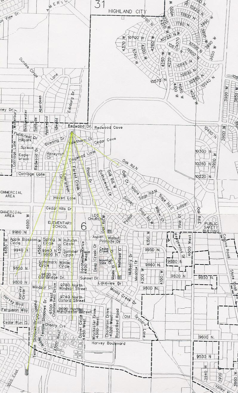 If you are on the map, I can get to you. If you are not on the map, I might still be able to get to you, but we will need a big antenna. Big antennas cost $60 more than the little antennas. Map 9-2001: Added another antenna. Should be able to reach all of Cedar Hills and most of American Fork near Cedar Hills. |